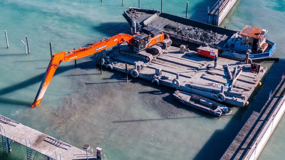 HITACHI ha fornito un escavatore ZX350LC Super Long Front equipaggiato con gli impianti 3d iCON di Leica Geosystems alla Hildebrand OHG per un delicato cantiere di dragaggio in un sito Unesco sul Lago di Costanza.