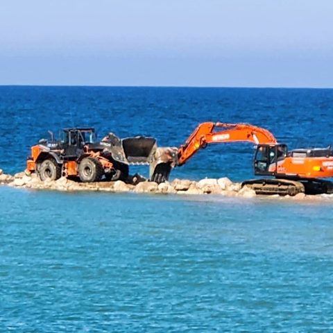 Anche in quest’occasione gli escavatori Hitachi ZX300 e ZX240, insieme alle pale ZW180 e ZW250, hanno lavorato per preparare il piano di posa ed il posizionamento dei materiali. Sempre, tra le altre cose, operando direttamente sulla battigia e, in alcune fasi, su rilevati provvisori realizzati in mare.